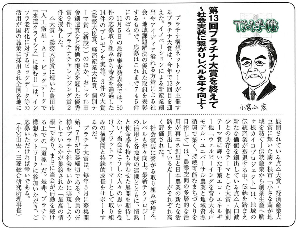 TOP >ニュース 財界(2025年12月10日号(11月19日発売))の連載記事「TM手帖」が掲載されました。 2025年12月24日 会長VOICE 財界の小宮山による連載記事「TM手帖」に「第13回プラチナ大賞」に関する記事が掲載されました。 財界は、ビジネス書籍の独立系出版社「財界研究所」が出版する財界人(実業家)を取り上げる雑誌です。その中で小宮山会長が「TM手帖」という欄を執筆しており、毎回、当会会員事業を含む各地の先導的な取組みを紹介しています。 プラチナ大賞の詳細は こちら 【出典】2025年12月10日号(11月19日発売) 一覧に戻る